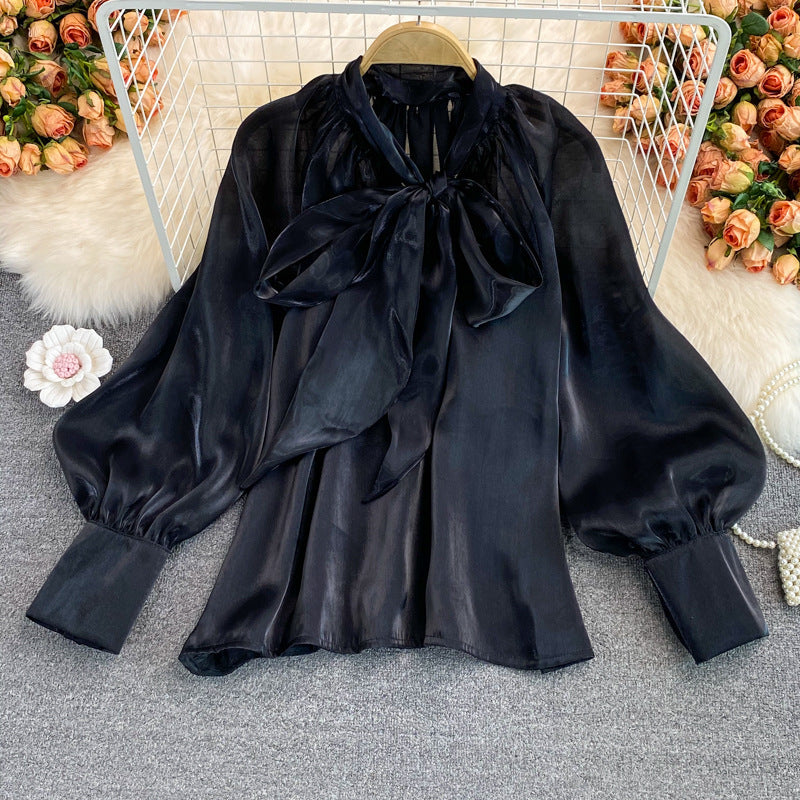 Super Fairy Loose Belly-covering Bow Lace-up French Plus Size Shirt Long Sleeve Elegant Top For Women