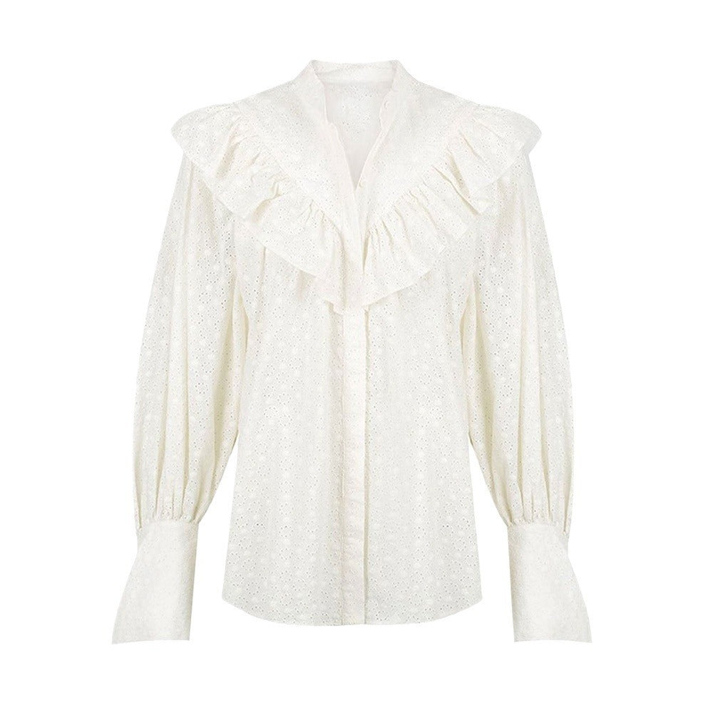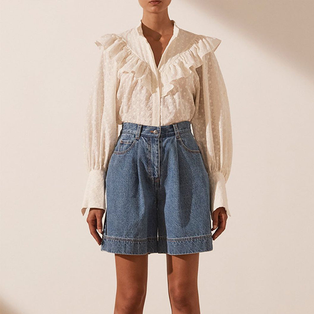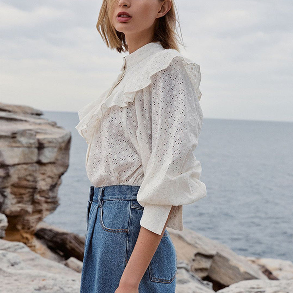 Women’s Loose Jacquard Cotton Button Long-sleeved Top